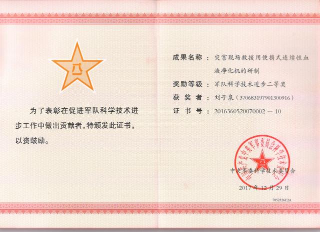 Title of Achievement:灾害现场救援用便携式连续性血液净化机的研制